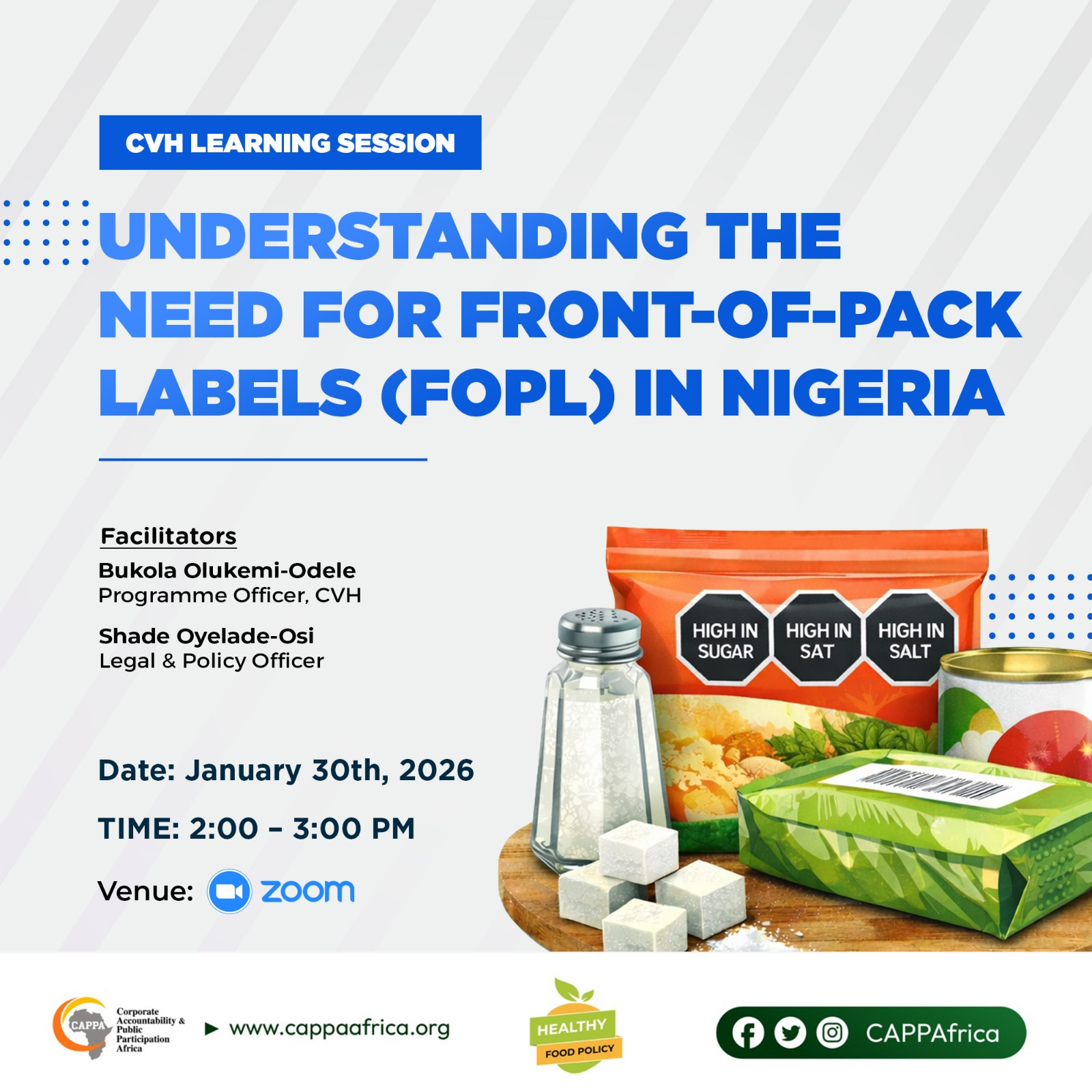 In a critical step toward advancing public health and informed consumer choices, Corporate Accountability & Public Participation Africa (CAPPA Africa) is hosting a timely learning session on front-of-pack labels (FOPL). The webinar, titled “Understanding the Need for Front-of-Pack Labels (FOPL) in Nigeria,” will unpack the role of FOPL in shaping healthier food environments and addressing nutrition-related challenges in the country.