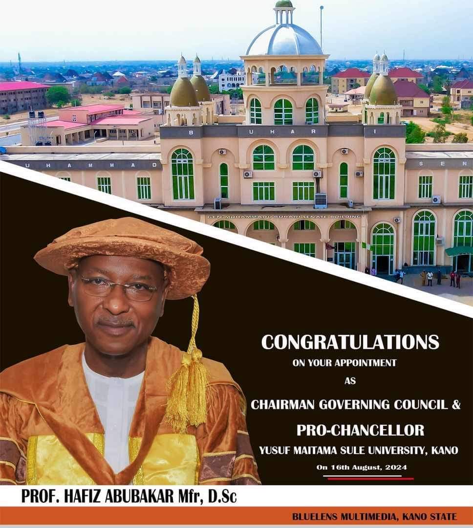 We rejoice with His Excellency, Prof Hafiz Abubakar, former Deputy Governor of Kano State, a Fellow and Member Board of Trustees of the Nutrition Society of Nigeria on his appointment as the Pro-Chancellor of Yusuf Maitama Sule University, Kano State.