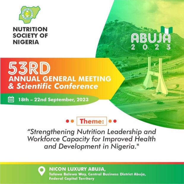 The Nutrition Society of Nigeria invites Nutritionists, Dietitians, Food Scientists, and other related professionals from Tertiary Institutions, Health Institutions, Research Institutes, Government Ministries, Departments and Agencies, Industries, Development Partners, and Organized Private Sector and Non-Governmental Organisations (NGOs) to its 53rd Annual General Meeting and Scientific Conference scheduled to hold in Abuja, Nigeria.