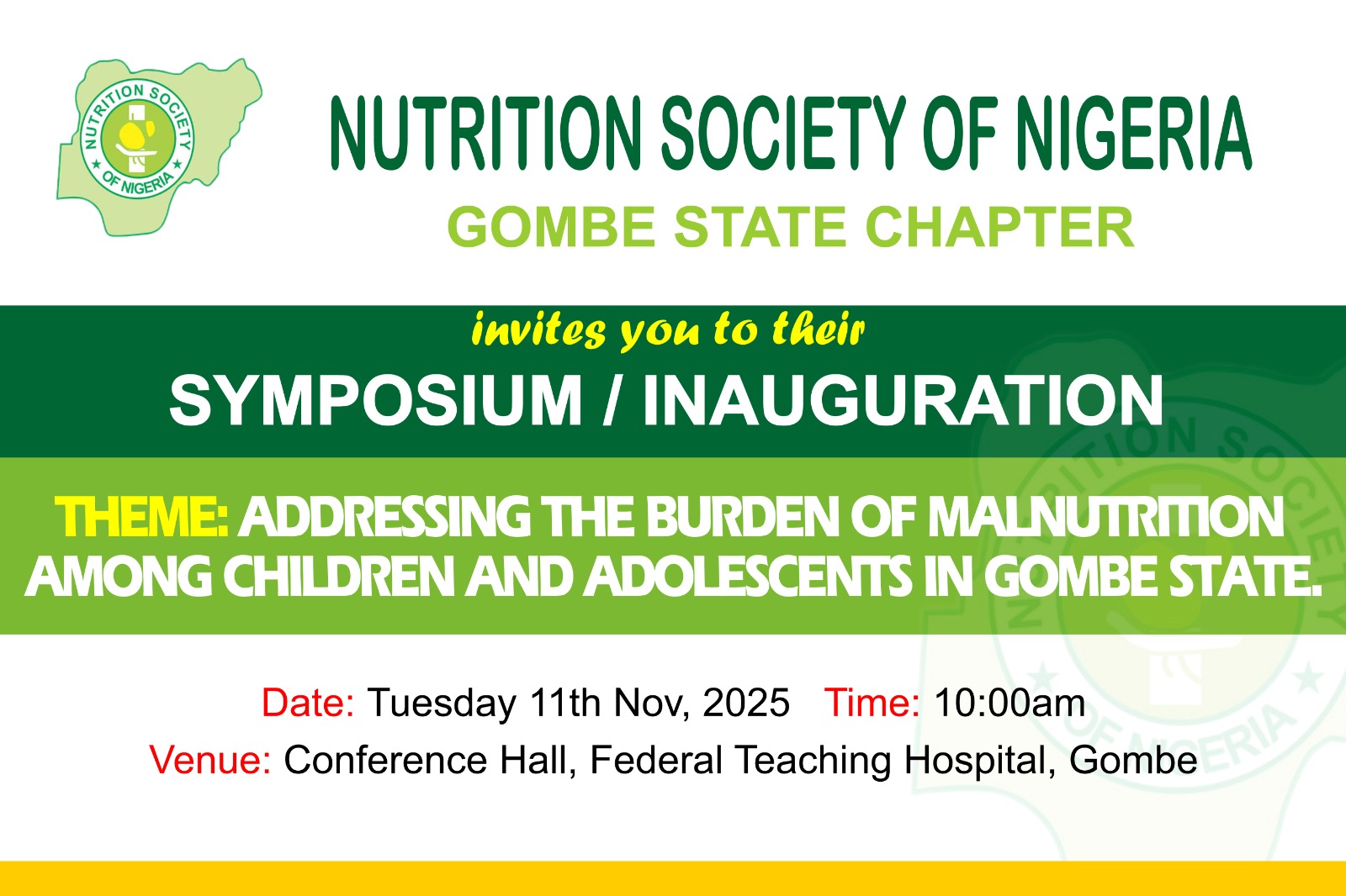 The Nutrition Society of Nigeria cordially invites stakeholders, health professionals, policymakers, and members of the general public to the official inauguration of its Gombe State Chapter, followed by insightful sensitization tagged “Addressing the Burden of Malnutrition Among Children and Adolescents in Gombe”