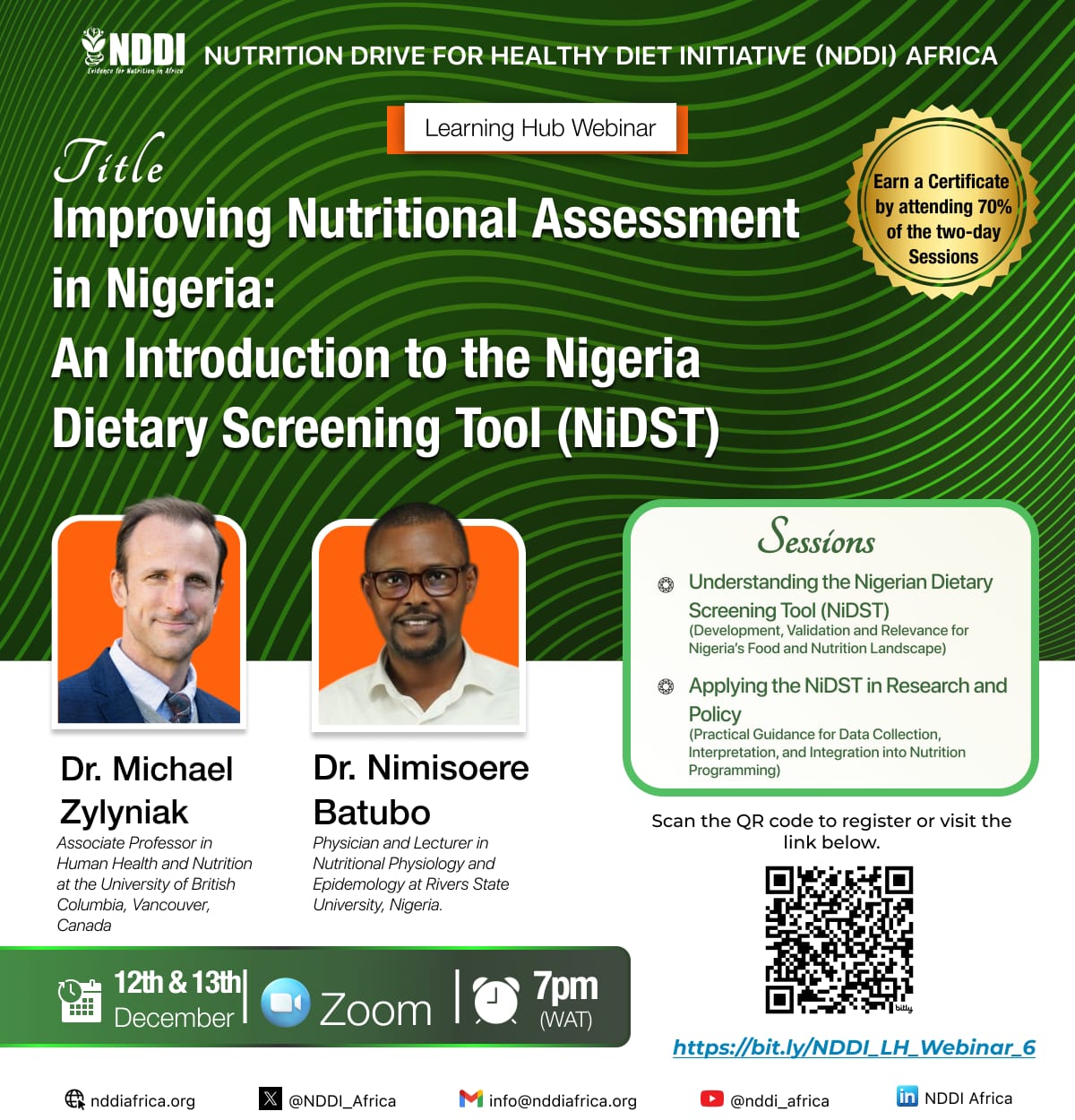 Join Dr. Michael Zulyniak and Dr. Nimisoere Batubo for a 2-day webinar focused on introducing the Nigeria Dietary Screening Tool (NiDST) a locally-developed instrument designed to improve the accuracy, relevance, and efficiency of dietary screening across clinical and community settings in Nigeria.