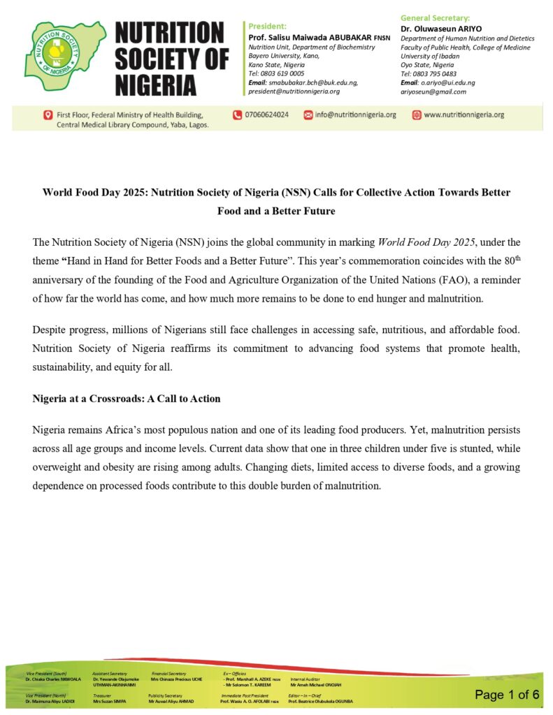 The Nutrition Society of Nigeria (NSN) joins the global community in marking World Food Day 2025, under the theme “Hand in Hand for Better Foods and a Better Future”. This year’s commemoration coincides with the 80th anniversary of the founding of the Food and Agriculture Organization of the United Nations (FAO), a reminder of how far the world has come, and how much more remains to be done to end hunger and malnutrition.