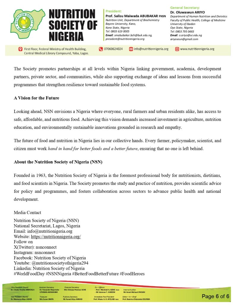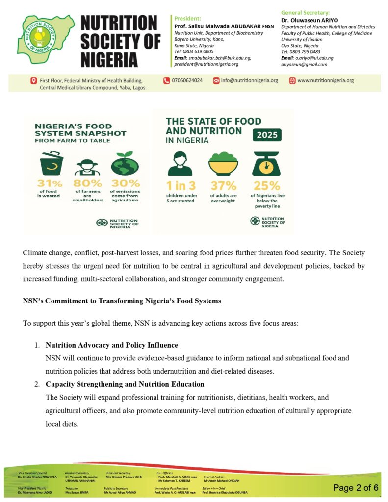 Despite progress, millions of Nigerians still face challenges in accessing safe, nutritious, and affordable food. Nutrition Society of Nigeria reaffirms its commitment to advancing food systems that promote health, sustainability, and equity for all.