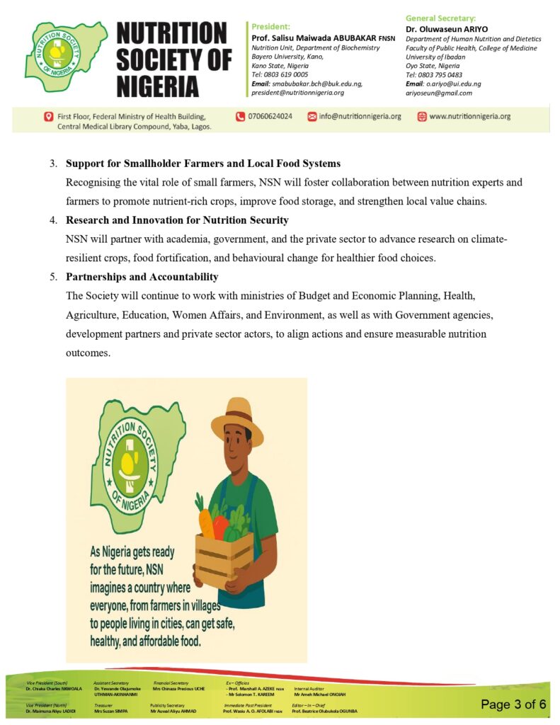 Looking ahead, NSN envisions a Nigeria where everyone, rural farmers and urban residents alike, has access to safe, affordable, and nutritious food. Achieving this vision demands increased investment in agriculture, nutrition education, and environmentally sustainable innovations grounded in research and empathy.