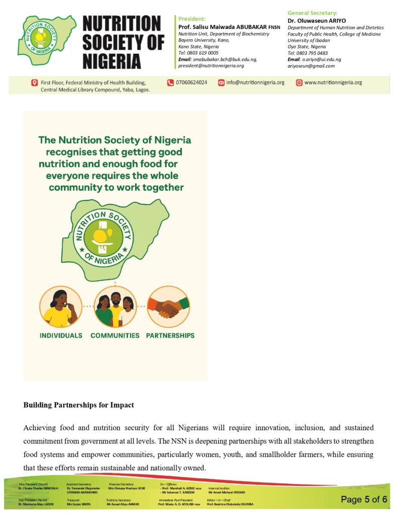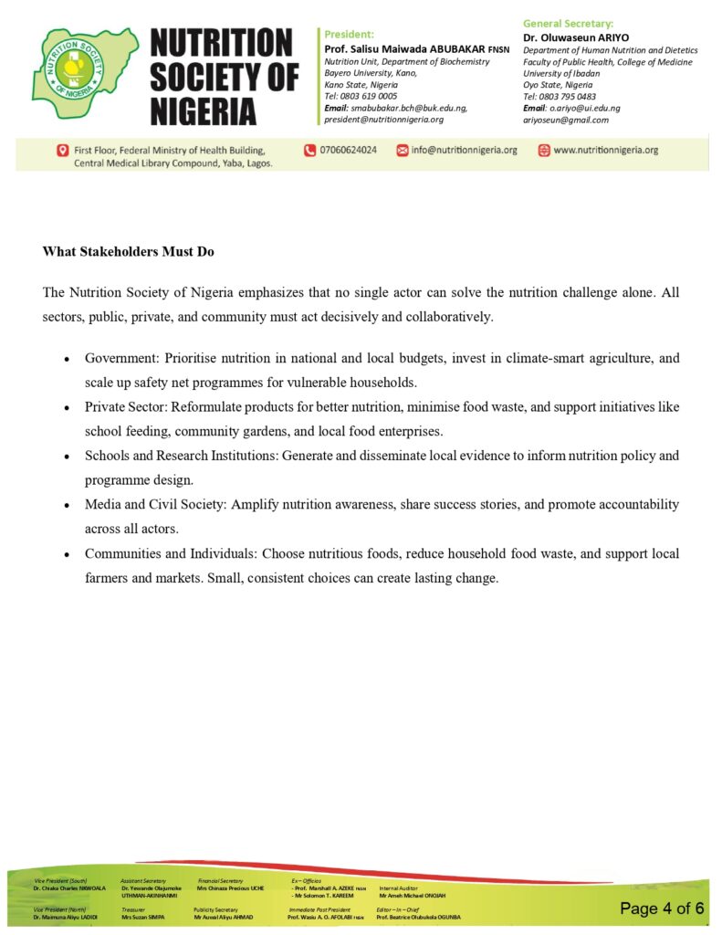 The Nutrition Society of Nigeria emphasizes that no single actor can solve the nutrition challenge alone. All sectors, public, private, and community must act decisively and collaboratively.